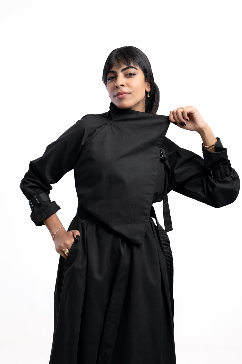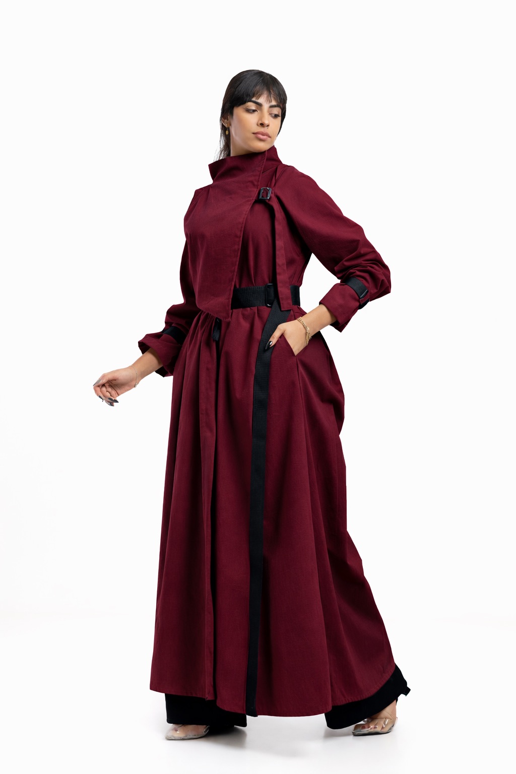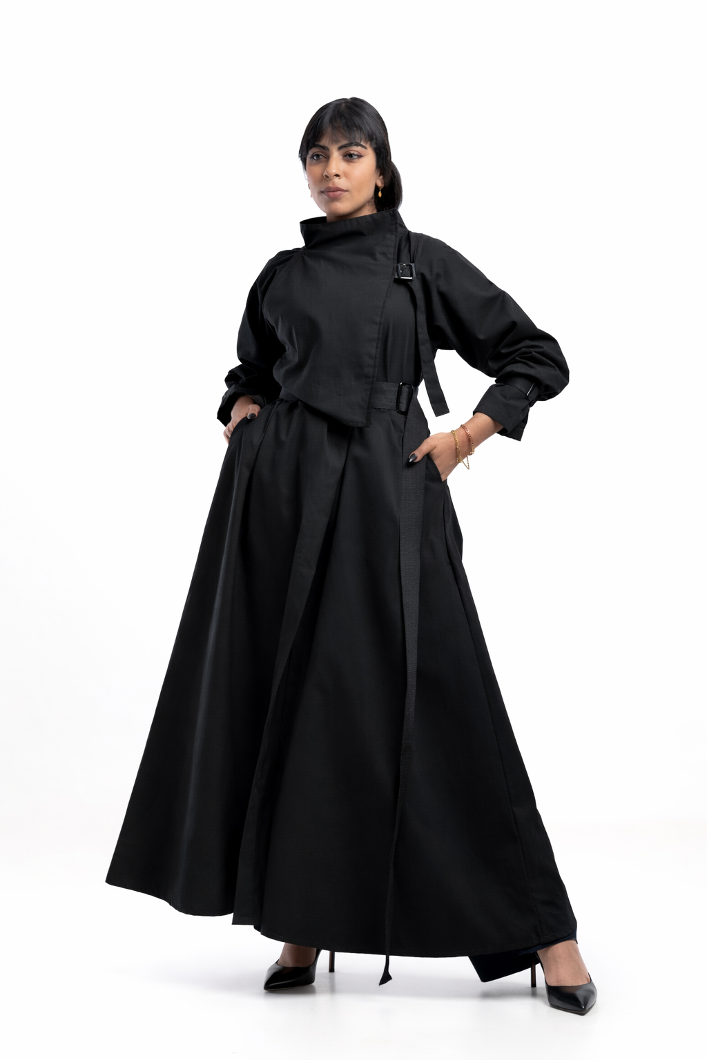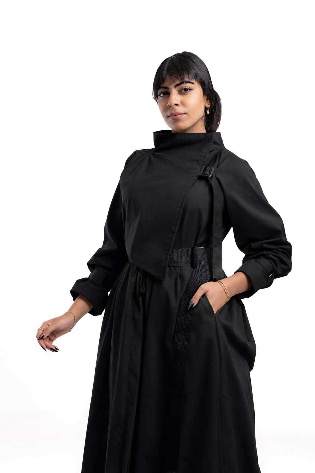 A double-breasted trench-style dress featuring an architectural high neck and a structured, draped bodice that creates an elegant, elongated silhouette.
