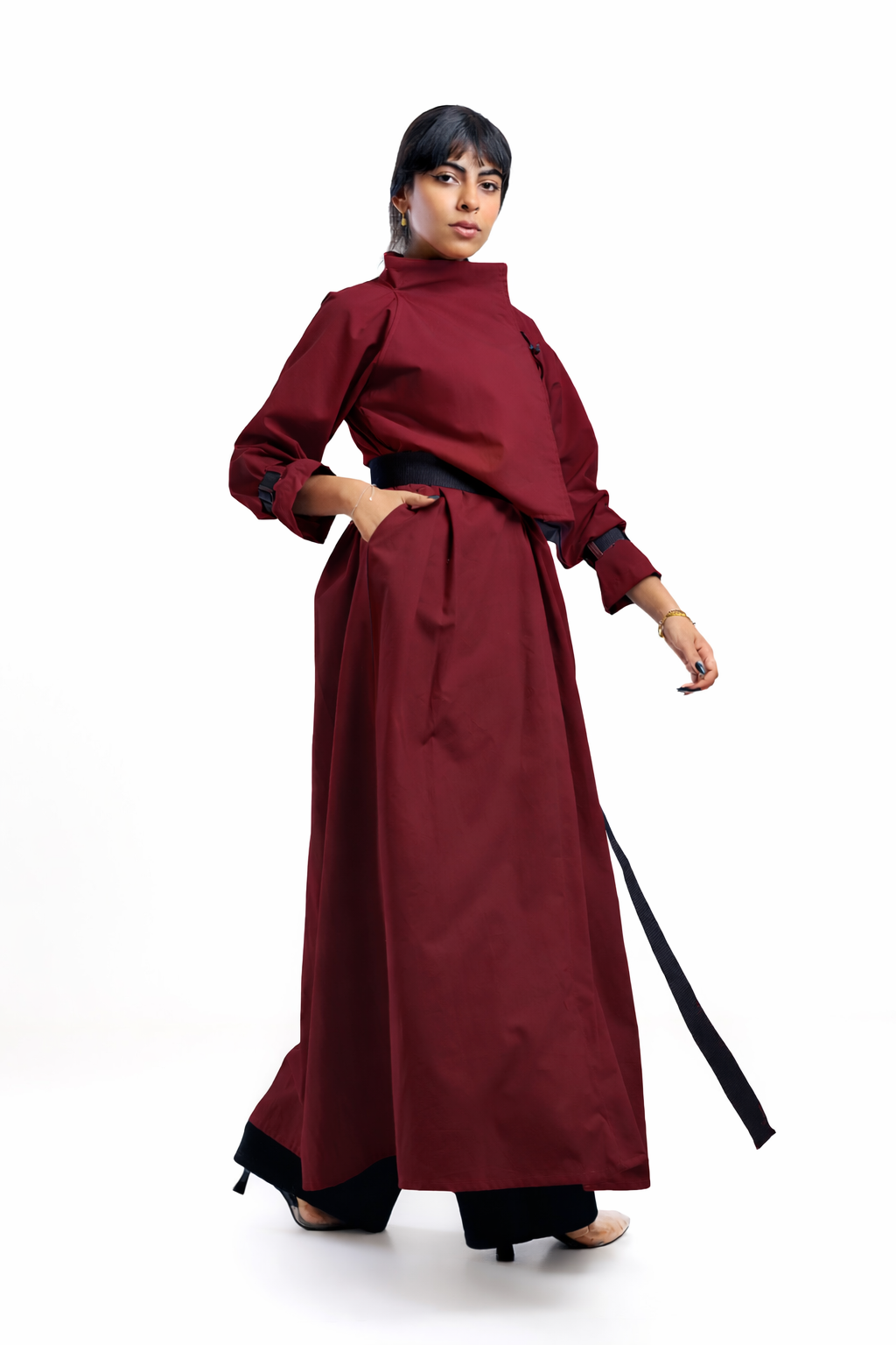 A wide contrasting black belt accentuates the waist, adding definition while maintaining all-day comfort.