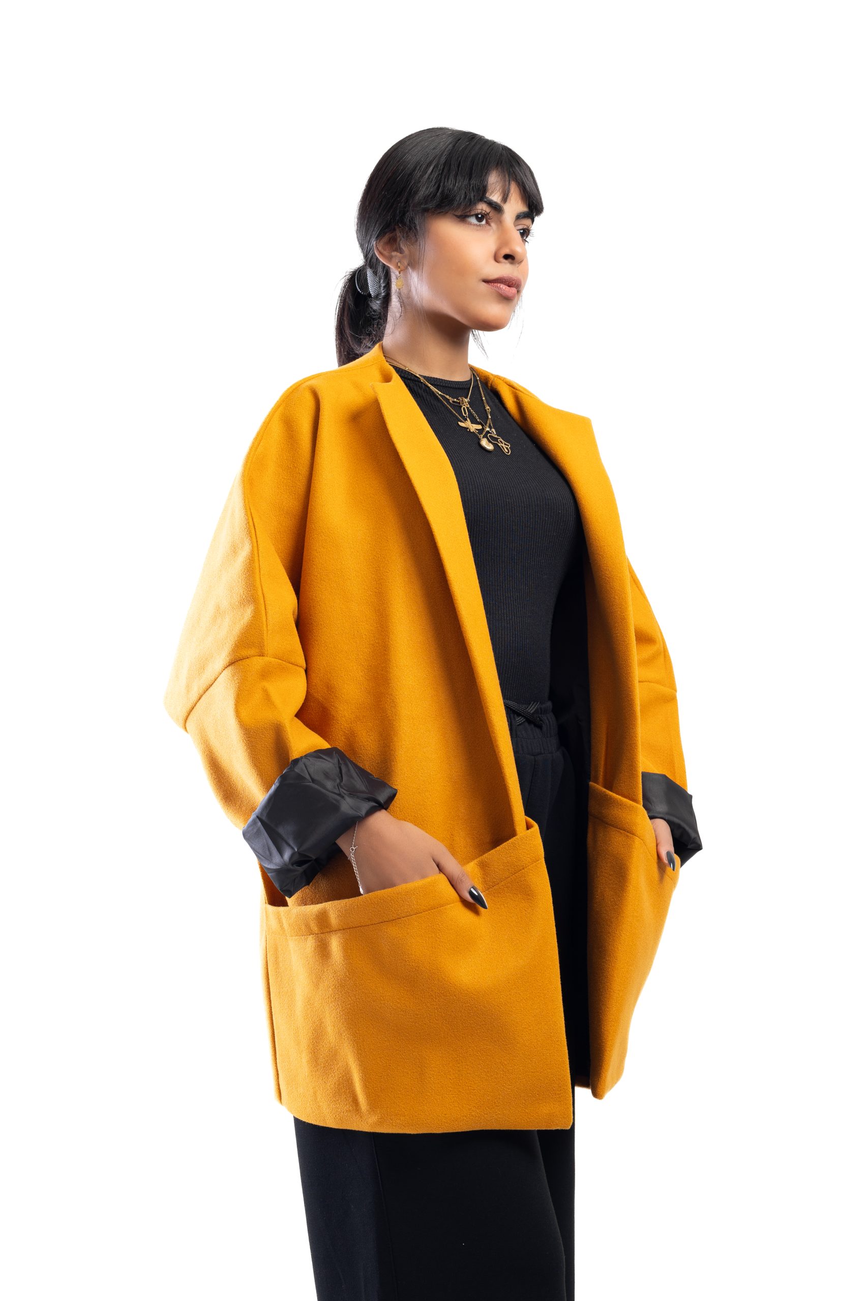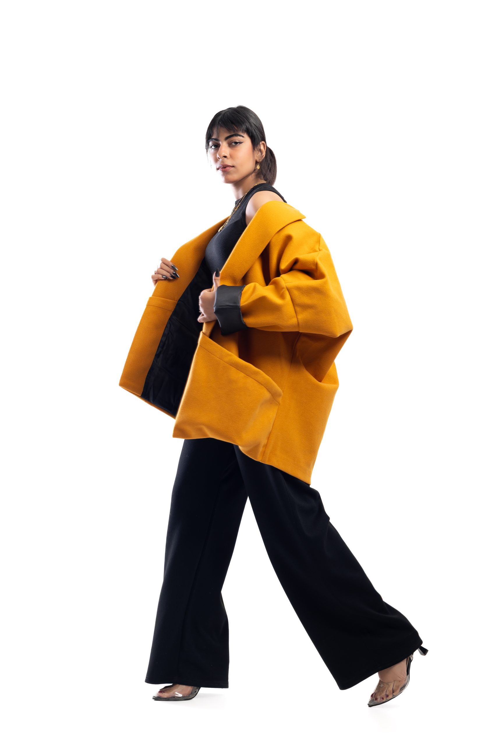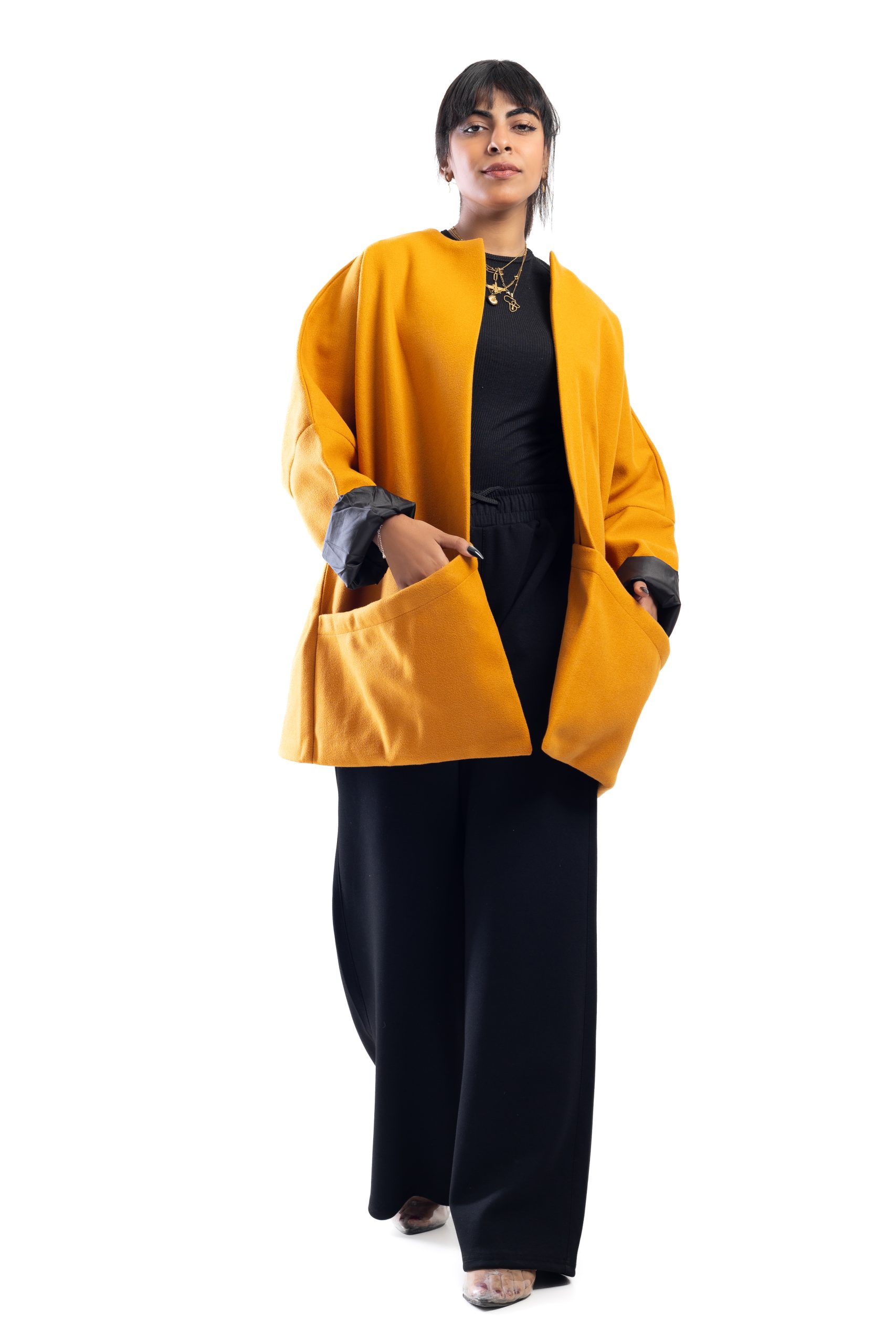 • Vibrant mustard tone, oversized open-front silhouette with bold, functional pockets.