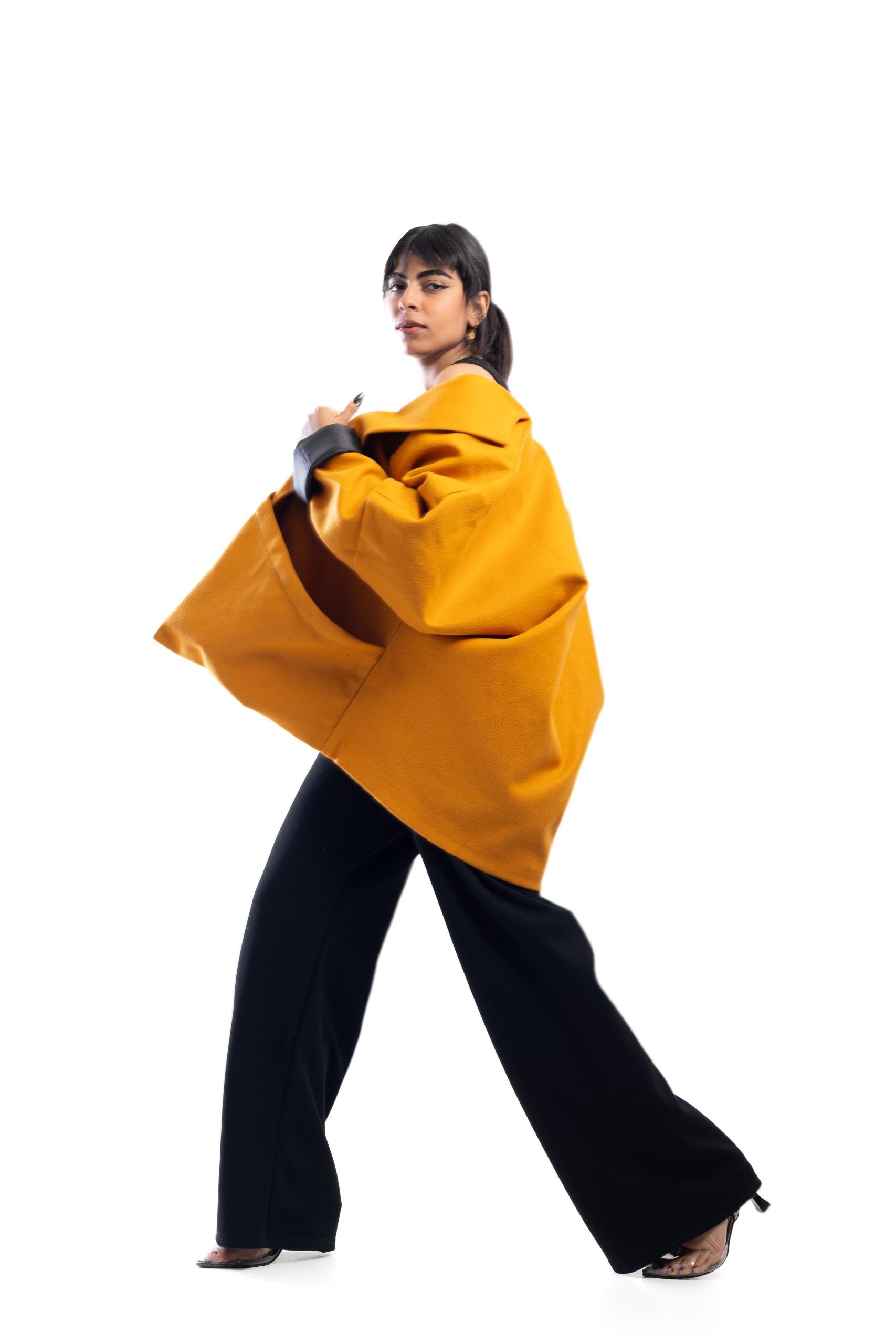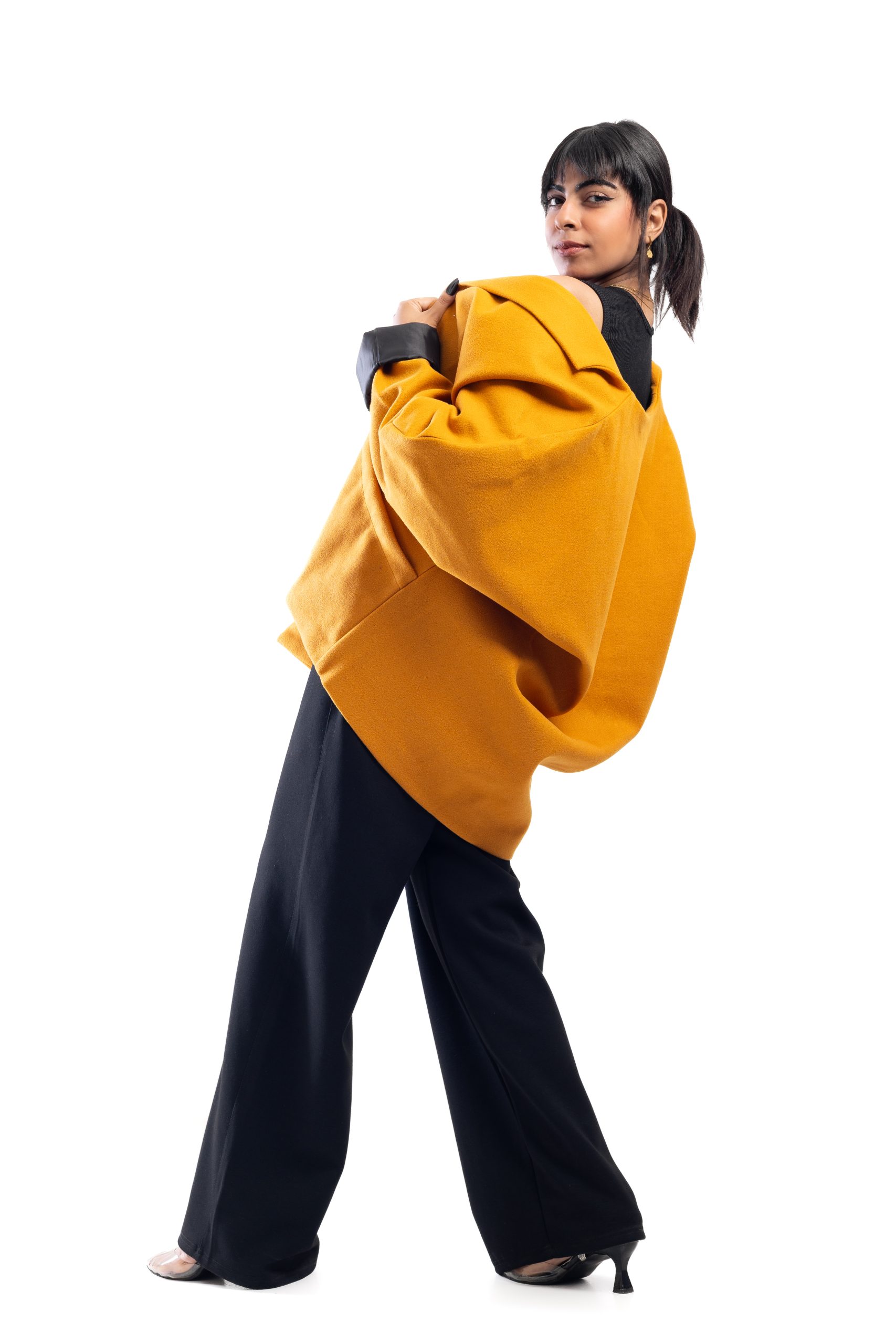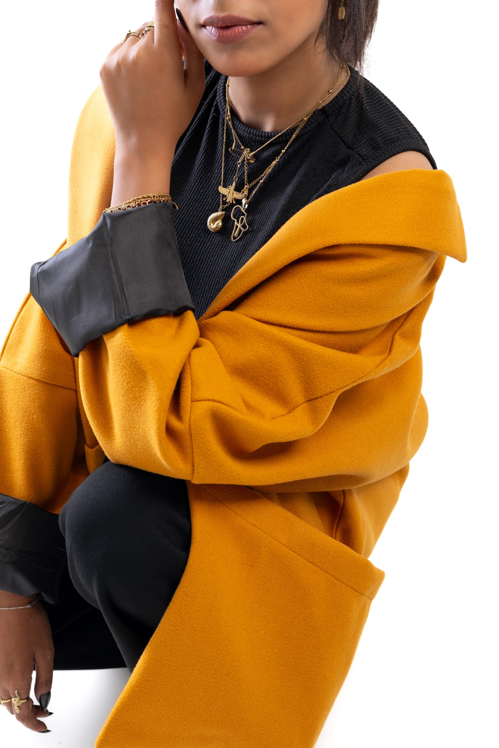 • Vibrant mustard tone, oversized open-front silhouette with bold, functional pockets.